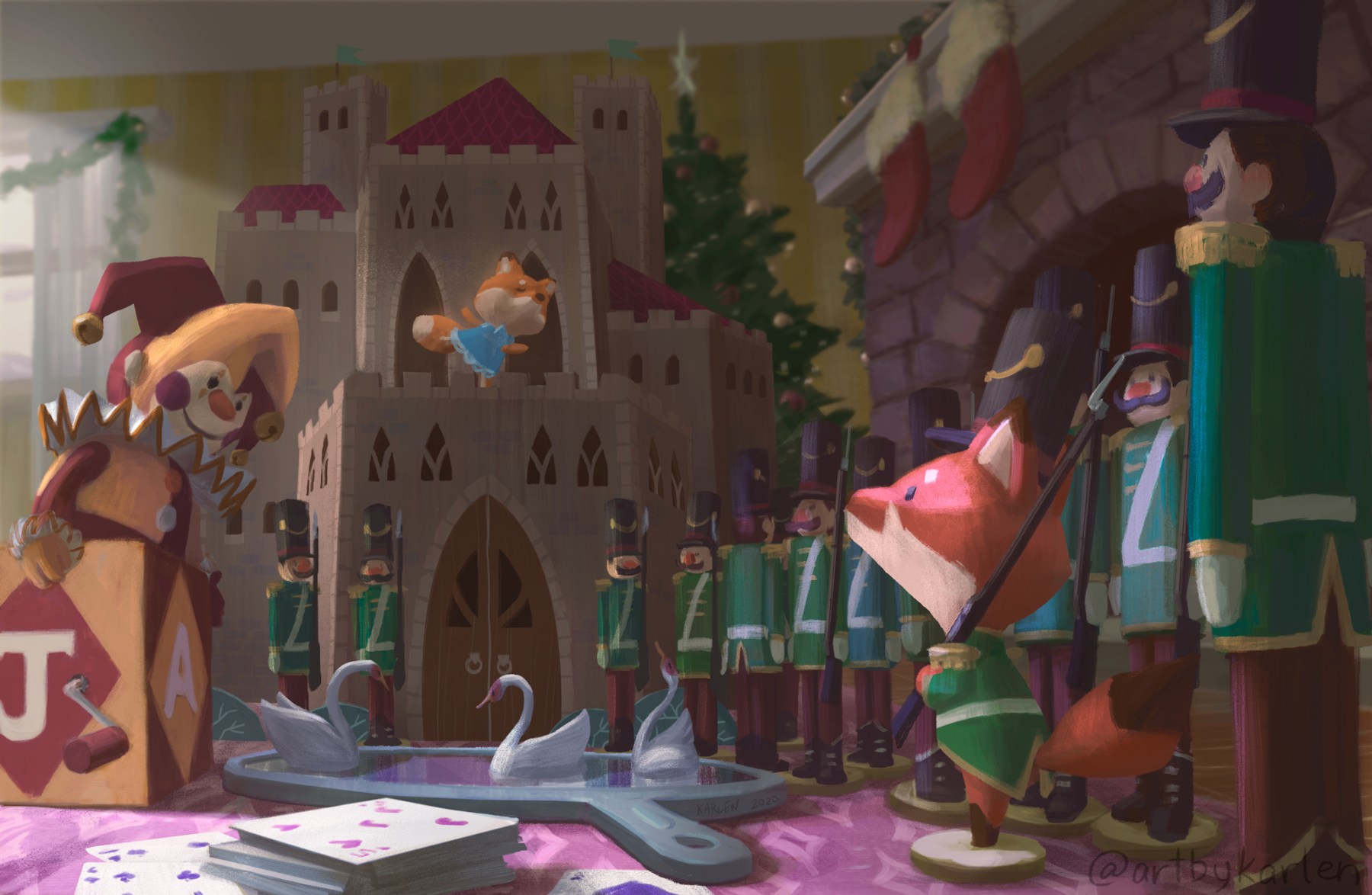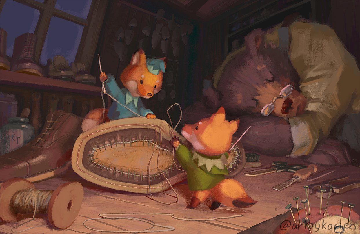 Holiday card illustrations featuring my fox characters getting lost in a good story.