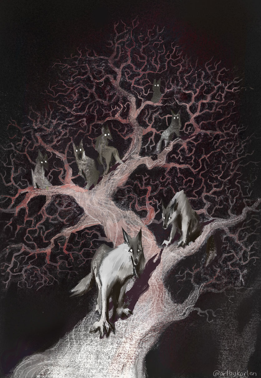 Illustration inspired by short story The Truth is a Black Cave in the Mountains. “Something, a finger I thought, touched my hand: it was not bony and hard. It was was soft, and humanlike, but too cold. He sleeps.“