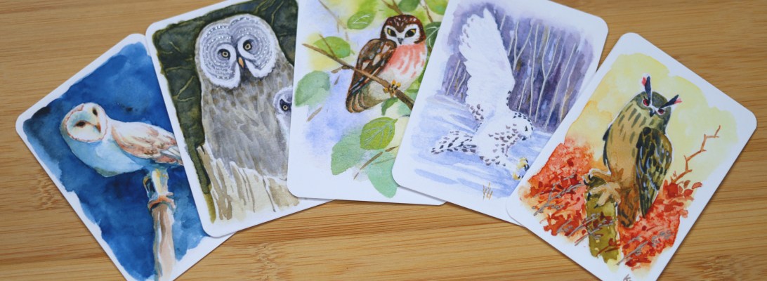 Following the ACEO series of winter birds I started last year, I completed another set of art cards featuring owls. Collectively, a group of these birds is called a hoot, or a parliament of owls.